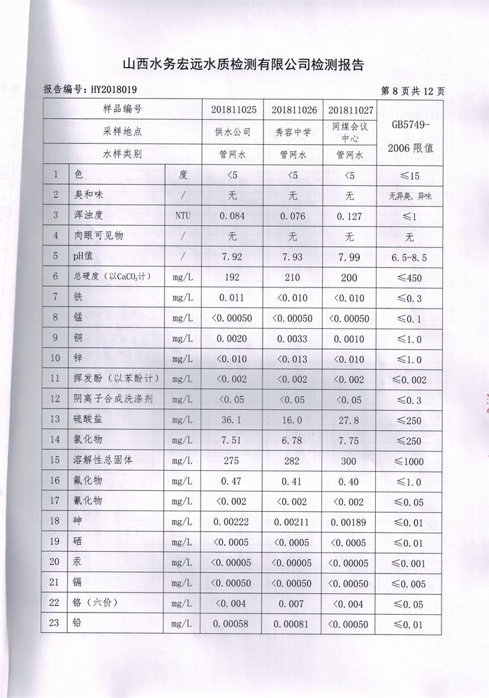 忻州城區(qū)公共供水水源水、出廠水、管網(wǎng)水、管網(wǎng)末梢水2018年11月份水質(zhì)信息公示