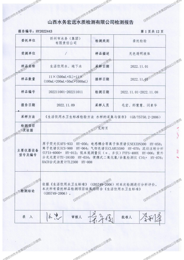 忻州城區(qū)公共供水水源水、出廠水、管網(wǎng)水、管網(wǎng)末梢水2022年11月份水質(zhì)信息公示